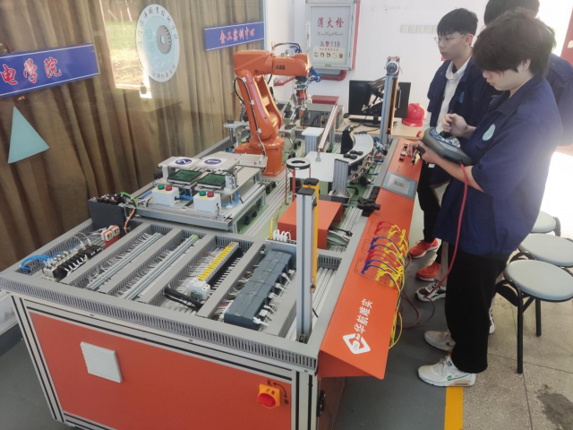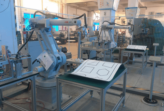 工业机器人实训室有ABB各类型机器人成套系统11套,华数搬运机器人1套,承担工业机器人基础、工业机器人应用系统集成、工业机器人现场编程等课程。