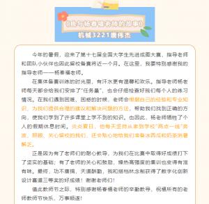 2024年教师节,为感谢杨春福老师在暑期成图大赛集体备赛期间的辛勤付出和暖心照顾,机械3221班唐伟杰分享了他与指导老师杨春福老师的故事,并致以真挚的教师节祝福。
