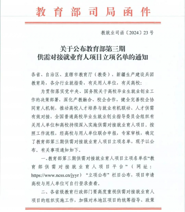 教育部高校学生司供需对接就业育人项目是贯彻落实党中央、国务院关于高校毕业生就业创业工作决策部署的重要举措之一,是深化产教融合、校企合作,推动人才培养与就业有机联动、人才供需有效对接的关键举措。未来,学院将以供需对接就业育人项目实施为契机,更加精准地了解企业的人才需求,调整和优化人才培养方案,提升校企协同就业育人成效,进一步增强毕业生的就业竞争力和高质量就业。