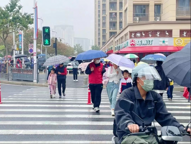 金海小学护学岗,志愿者护送小朋友过马路