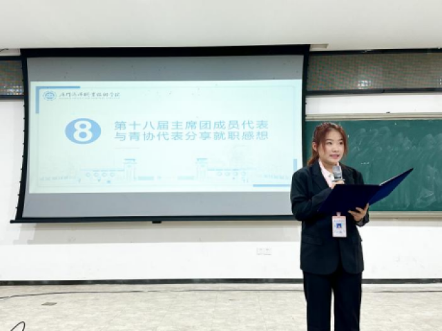 第十八届主席团代表王毅分享就职感想,她表示将在学习和工作中发挥干部先锋带头作用,将各项工作做深、做实、做细,精益求精,奋斗拼搏,用心用情为同学们提供服务,打造富有机电特色的活动品牌。
