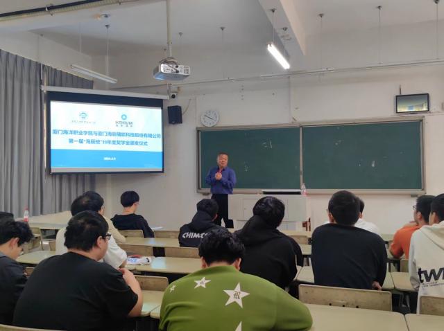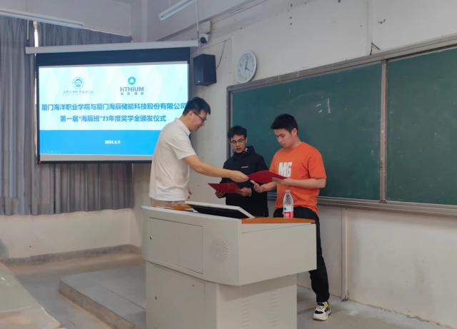 2024年4月9日,厦门海洋职业技术学院联合厦门海辰储能科技股份有限公司完成了2023年度“海辰班”奖学金的颁奖仪式,并为海辰班同学组织了一场设备安全知识分享会。出席此次活动的有海洋机电学院王忠杰院长、辅导员周晓维、海辰班全体同学及海辰储能的相关人员。