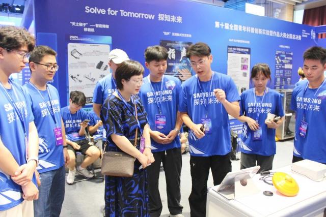 在第十届全国青年科普创新实验暨作品大赛现场介绍产品(右三)