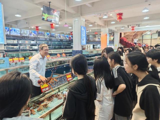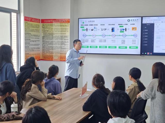 夏商国际水产交易中心的企业导师为同学们介绍智能管理平台、“一品一码”追溯信息化系统的运作场景。该平台通过大数据分析与云计算技术,实时整合市场内的交易数据、货物进出场动态、物流信息、食品检验信息等,实现从进场、检测、交易、凭证、出场、溯源的全链条智能调控。通过扫描产品包装上的二维码,消费者可一键追溯鱼虾蟹贝等水产品的产地信息、检验报告及流通轨迹,确保“从源头到餐桌”的透明化监管。