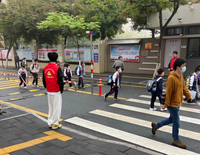 在每日清晨,你总能看到一群大学生身穿红马甲,风雨无阻,站在翔安区金海小学的门口执勤站岗。“大手牵小手,护送平安路”,这是他们的初心。