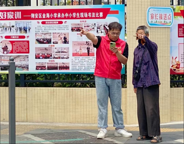 金海小学护学岗,志愿者给老爷爷指路