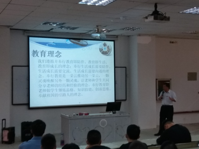王忠杰老师为新生讲述着我们机电系教育理念:教育即陪伴,教育即生活,教育即成长。