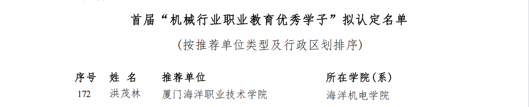 匠心铸就梦想,技能成就未来。近日,从机械工业教育发展中心传来喜讯,厦门海洋职业技术学院海洋机电学院机械设计与制造专业学生洪茂林经过层层选拔,成功荣获首届“机械行业职业院校优秀学子”称号,为福建省唯一高职院校获奖选手。