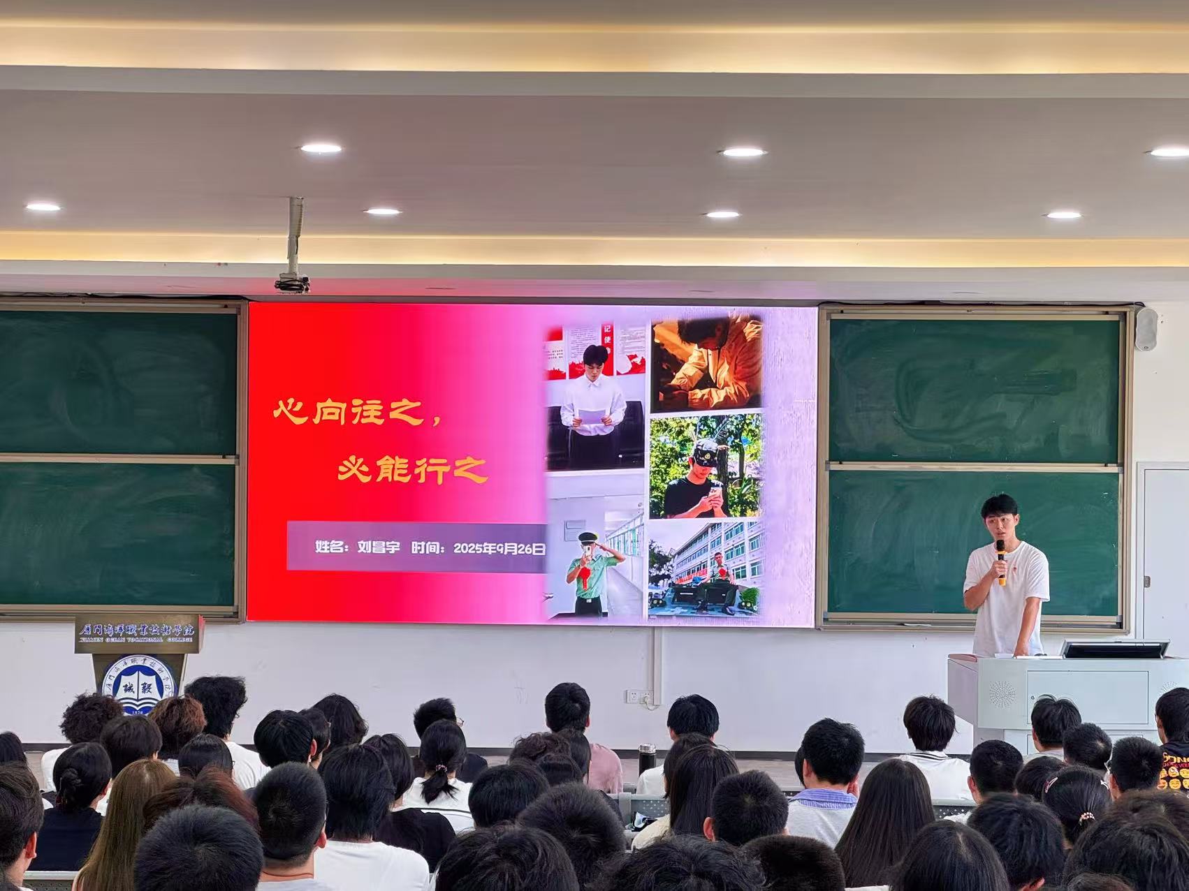 活动最后,刘昌宇同学分享了自己“从军营到校园,始终向党组织靠拢”的成长历程,从中讲述了自己的入党经历与成长感悟。他结合自身从递交入党申请书到参与志愿服务、担任学生干部的历程,让在场新生们真切感受到党员身份背后的责任与担当,进一步激发了大家向党组织靠拢的热情。
