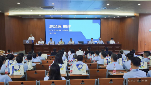 7月13日,我院与友达光电(厦门)有限公司在翔安校区T2报告厅联合举办现代学徒制机电3215班毕业典礼。海洋机电学院院长王忠杰、友达光电(厦门)有限公司(以下简称“友达(厦门)”)总经理李行贤、学校教务处副处长杨智玲、海洋机电学院副院长吕辉停、友达(厦门)S13厂长杨正伟、友达(厦门)人力资源处处长吴迺胤等学院领导和友达(厦门)高管出席仪式。
