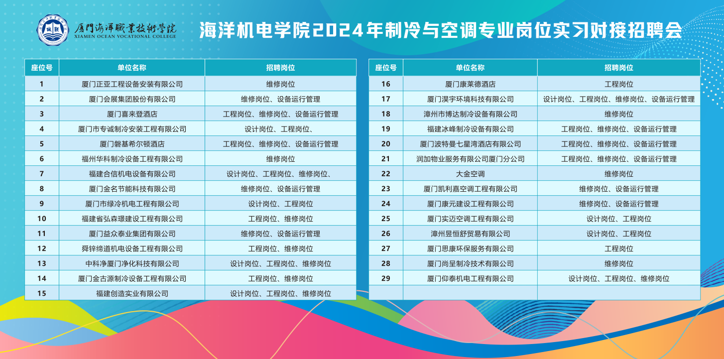 2024年5月14日,海洋机电学院成功举办2024年制冷与空调技术专业岗位实习对接招聘会。此次招聘会吸引了省内30多家知名企业参与,为即将步入实习阶段的学生提供了超过150个实习岗位选择。