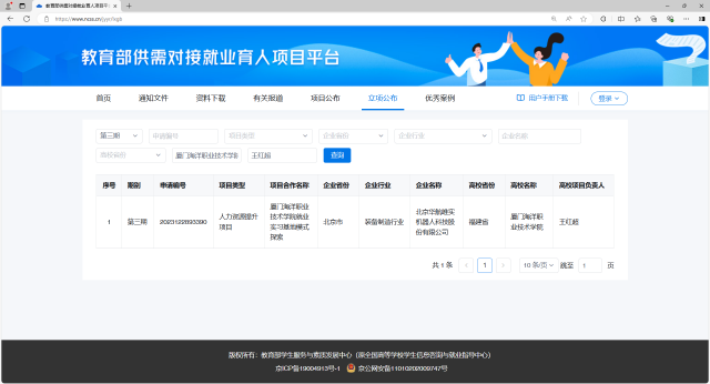 近日,教育部高校学生司印发《关于公布教育部第三期供需对接就业育人项目立项名单的通知》(教就业司函〔2024〕23号),在“教育部供需对接就业育人项目平台”(网址:https://www.ncss.cn/jyyr/)“立项公布”栏目公布立项名单。我院王红超老师申请的“厦门海洋职业技术学院就业实习基地模式探索”定向人才培养培训项目获批立项。