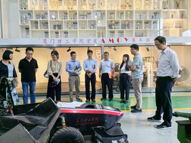交流会后,刘建春书记带领大家参观厦门理工学院宏发AMOY赛车俱乐部,赛车俱乐部党支部书记、机械与汽车工程学院副教授洪汉池全面分享了车队技术和团队管理方面的成功经验以及以党建为引领的社会所需要的全方位人才培养体系。