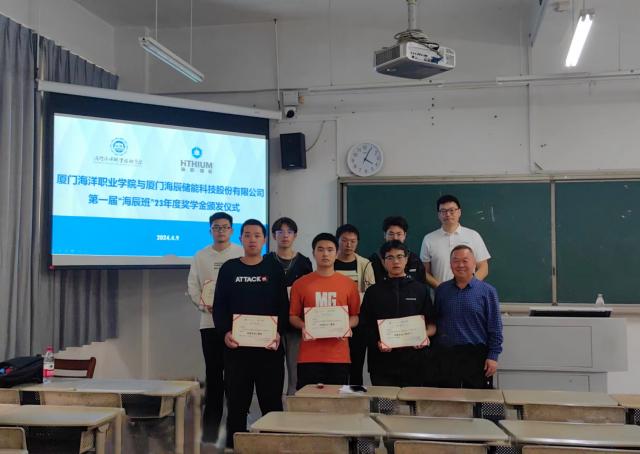 2024年4月9日,厦门海洋职业技术学院联合厦门海辰储能科技股份有限公司完成了2023年度“海辰班”奖学金的颁奖仪式,并为海辰班同学组织了一场设备安全知识分享会。出席此次活动的有海洋机电学院王忠杰院长、辅导员周晓维、海辰班全体同学及海辰储能的相关人员。