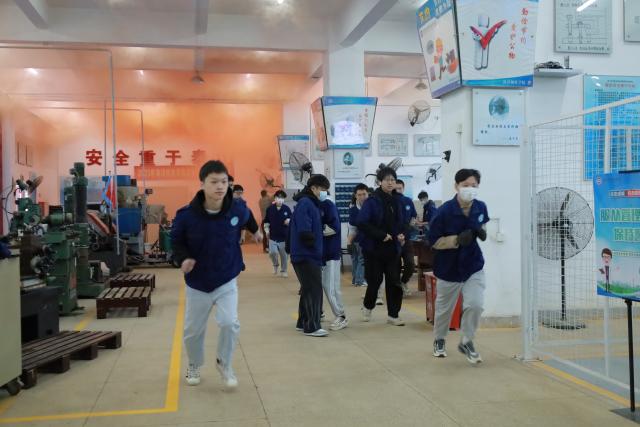 警报响起,烟雾弥漫。林宝金、张英科老师迅速组织学生撤离,严防踩踏事件发生。在老师的有序指导下,正在上课的港机3222班同学,按照规定路线,分路线快速、有序撤离至安全场地。