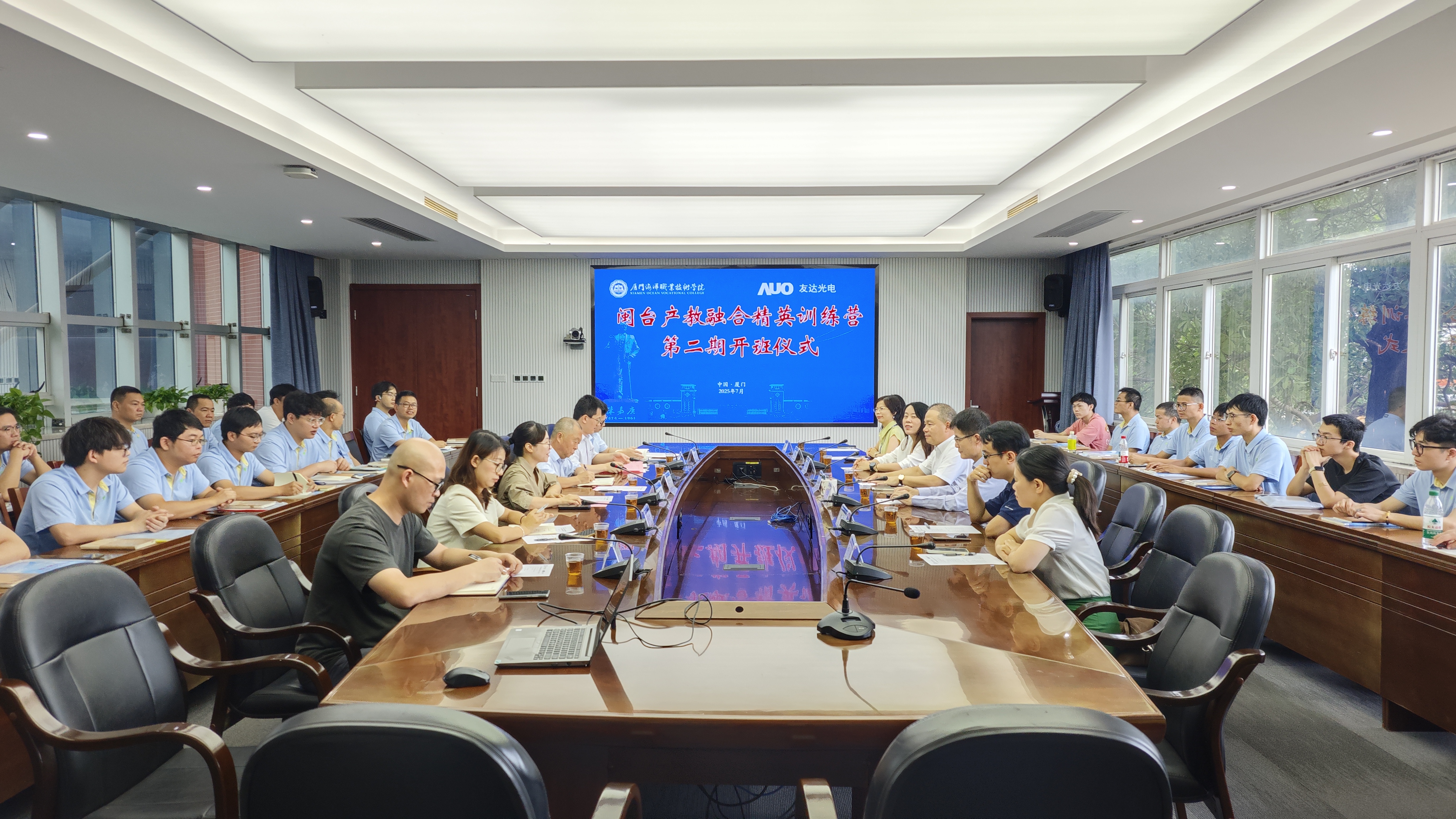 7月20日,闽台产教融合精英训练营第二期开班仪式在厦门海洋职业技术学院隆重举行。海洋机电学院党政领导、对外合作交流中心副主任俞琪琦、友达光电(厦门)有限公司总经理李行贤及企业高管团队出席开班仪式,会议由海洋机电学院副院长吕辉停主持。