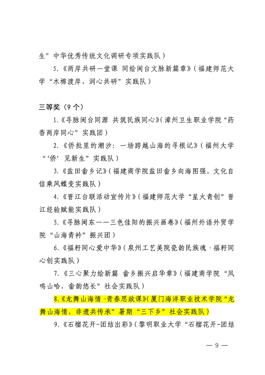 本次专项活动共有全省多所高校327支实践队参与,竞争激烈,该奖项由省民族与宗教事务厅、共青团福建省委、省学生联合会联合评审并通报表扬。实践队联合“海院龙狮社”、“山海情辅导员”工作室深入漳州坪水畲族村,以舞龙非遗为载体,促进多民族交往交流交融,生动践行了“铸牢中华民族共同体意识”的实践要求,展现了海院青年学子的责任担当与青春风采!